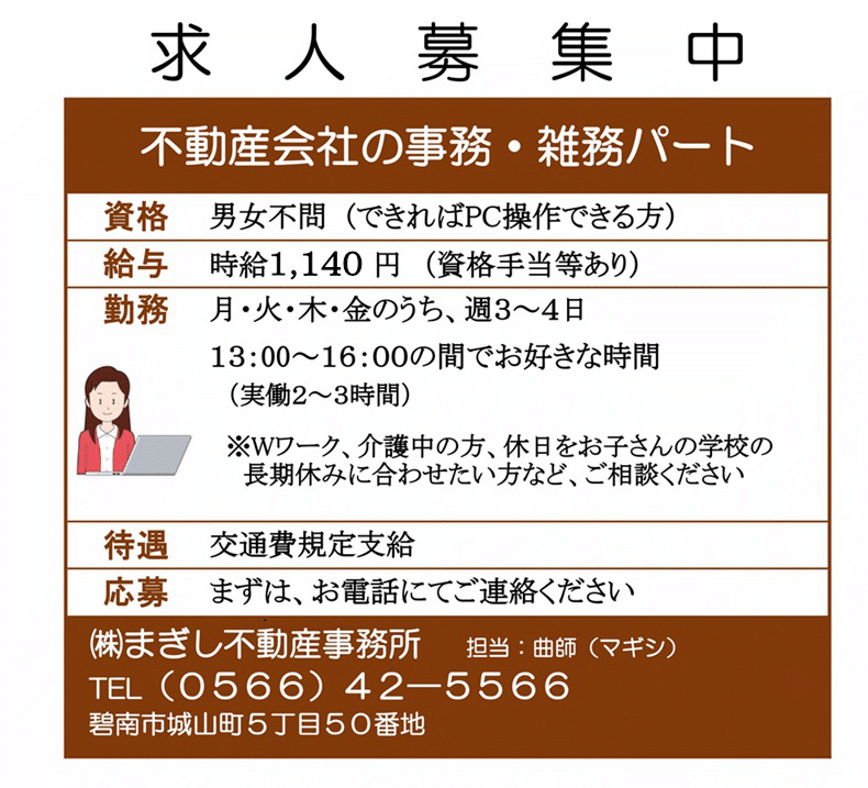 碧南市にある不動産の会社です。 事務所がわかりにくい場所にありますが、人目を気にせず、ゆっくり、じっくり、落ち着いて不動産や空き家相談ができる会社を目指しています。 お茶を飲みながらの雑談もOKですよ~(^^)